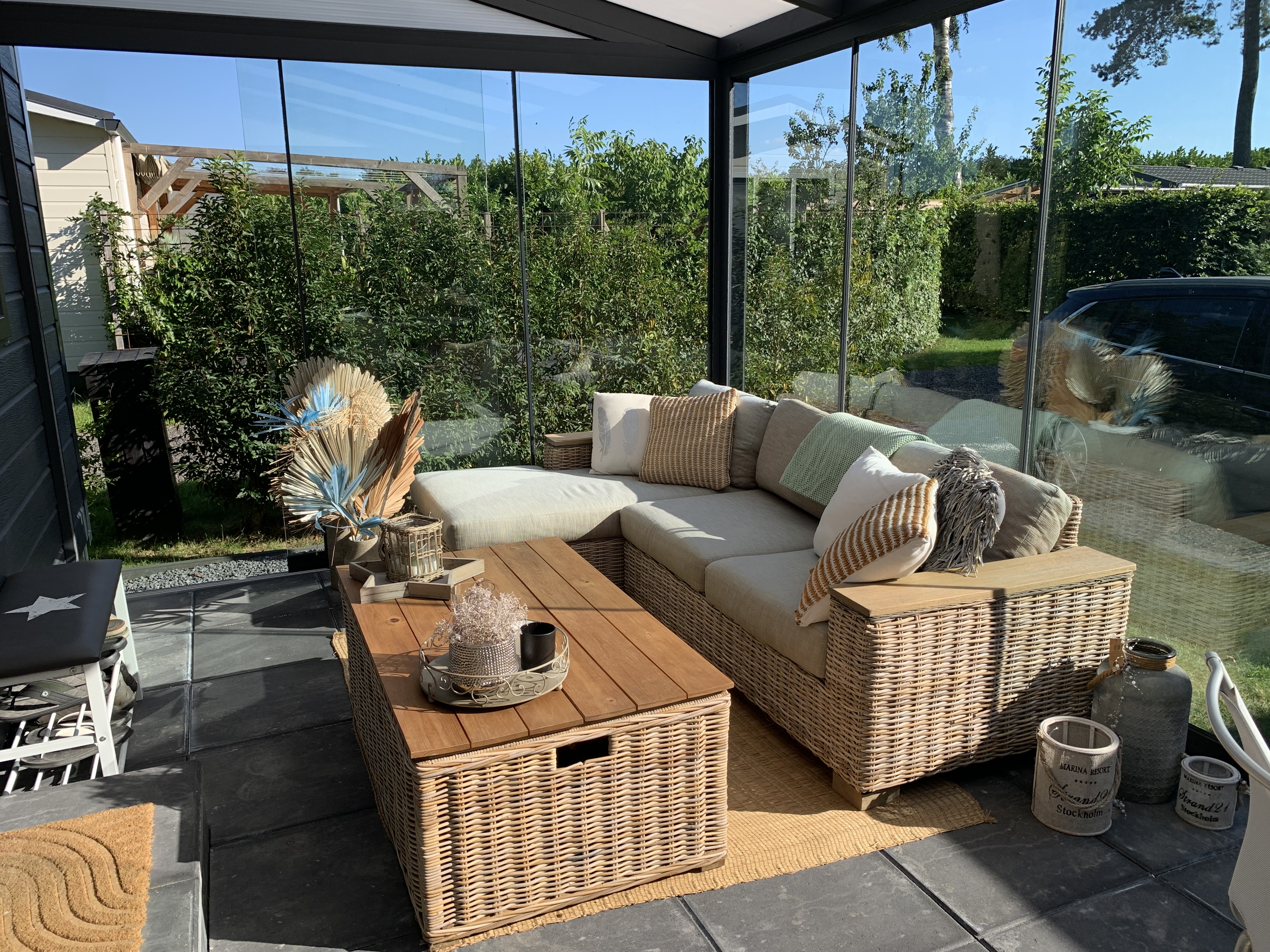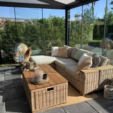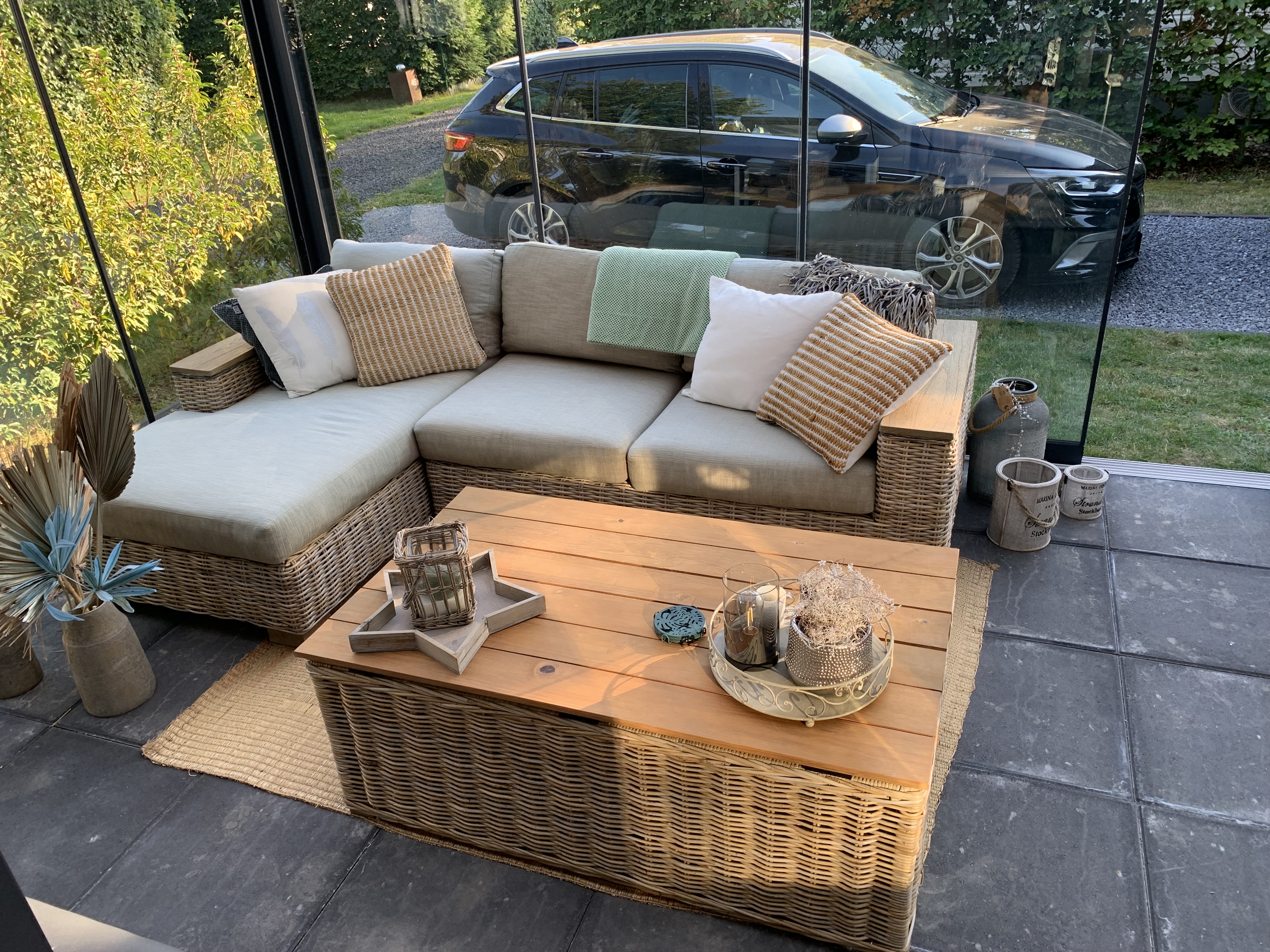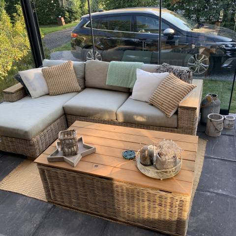 - Luxe rotan zithoek; L-bank met comfortabele kussens en bijpassende tafel met veel bergruimte (2024)