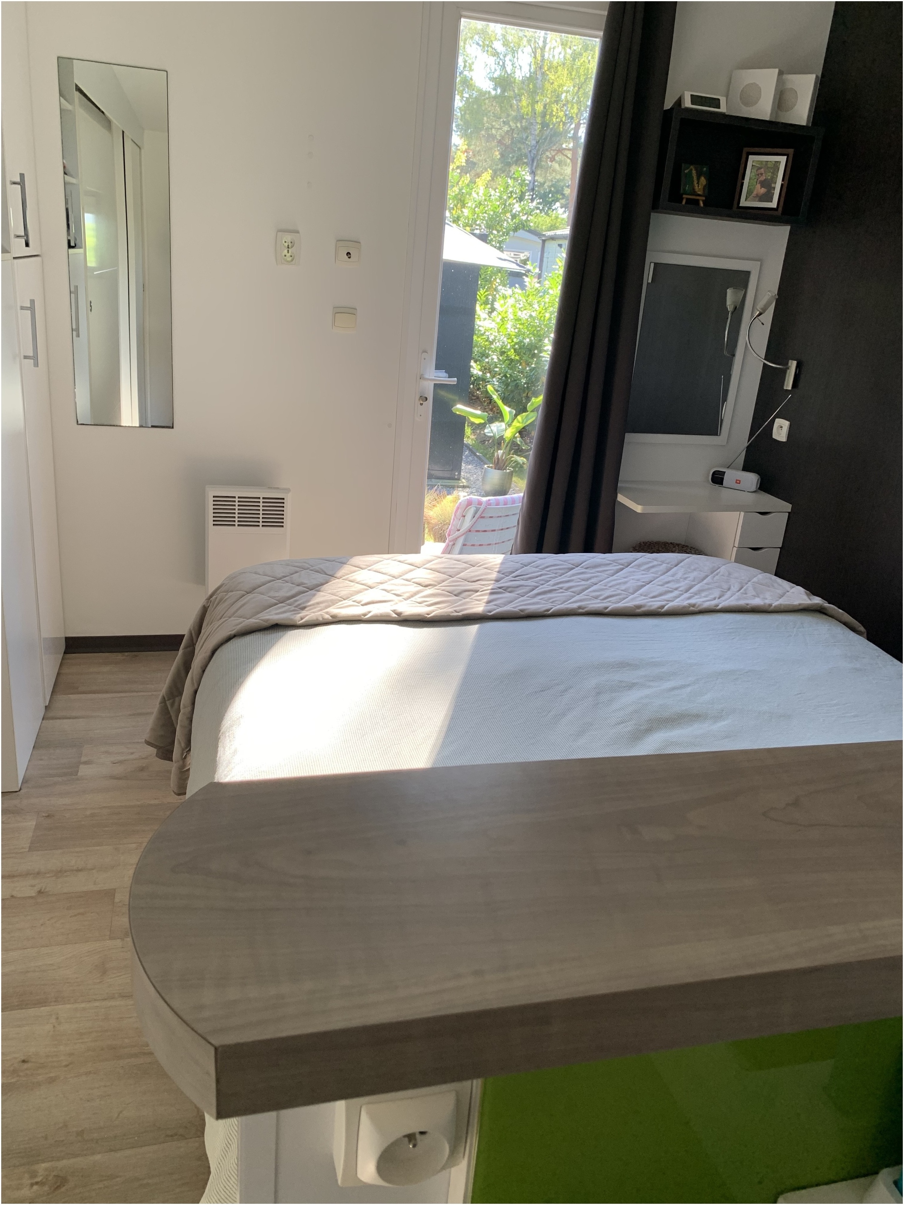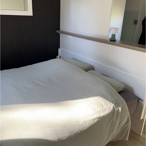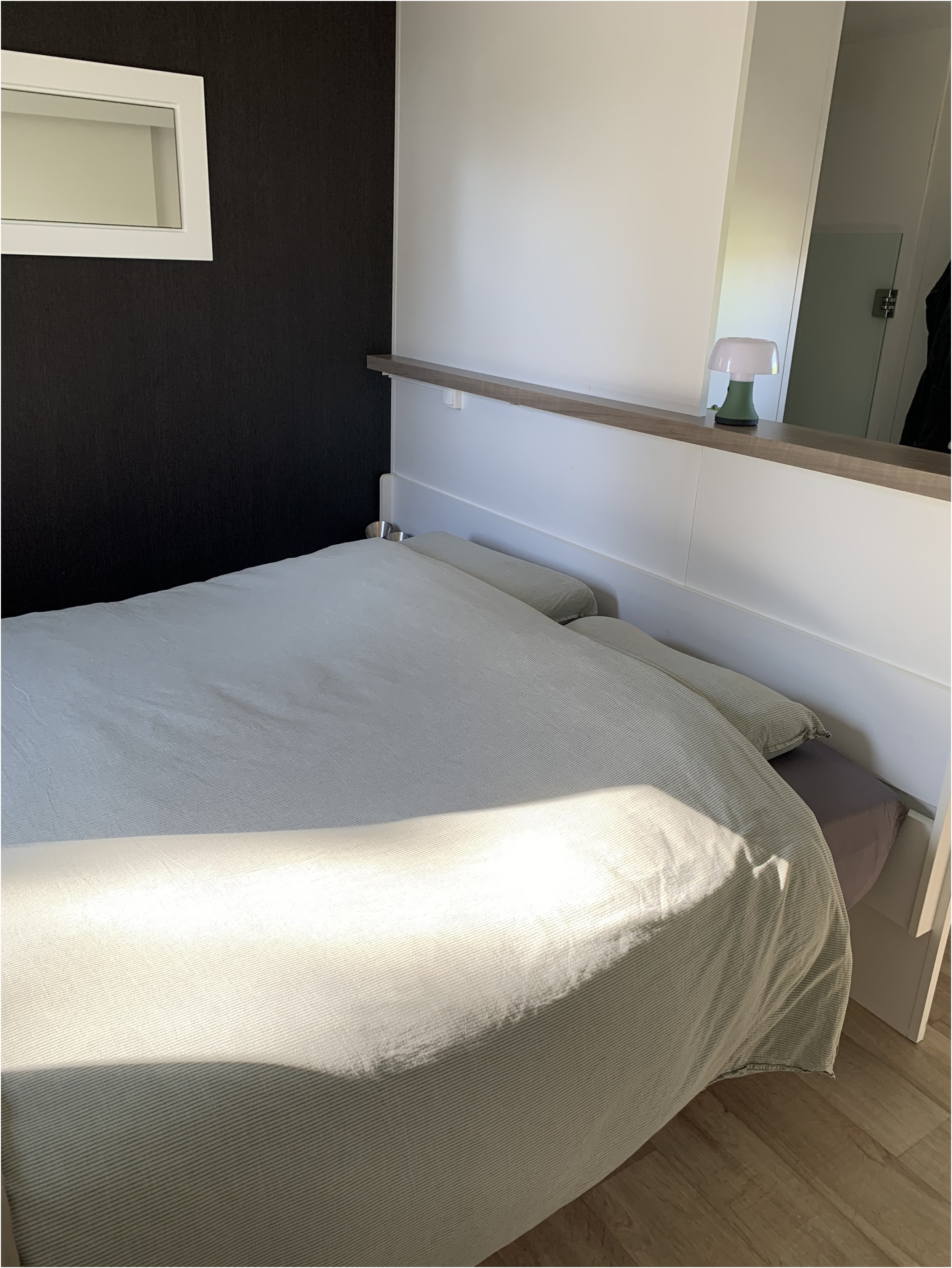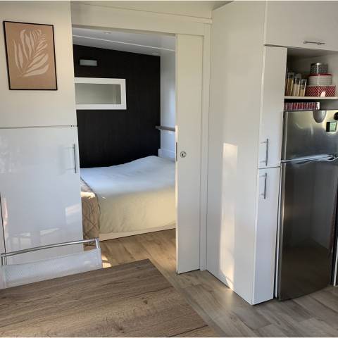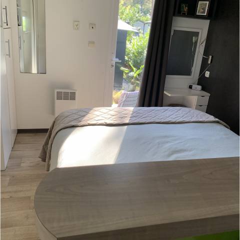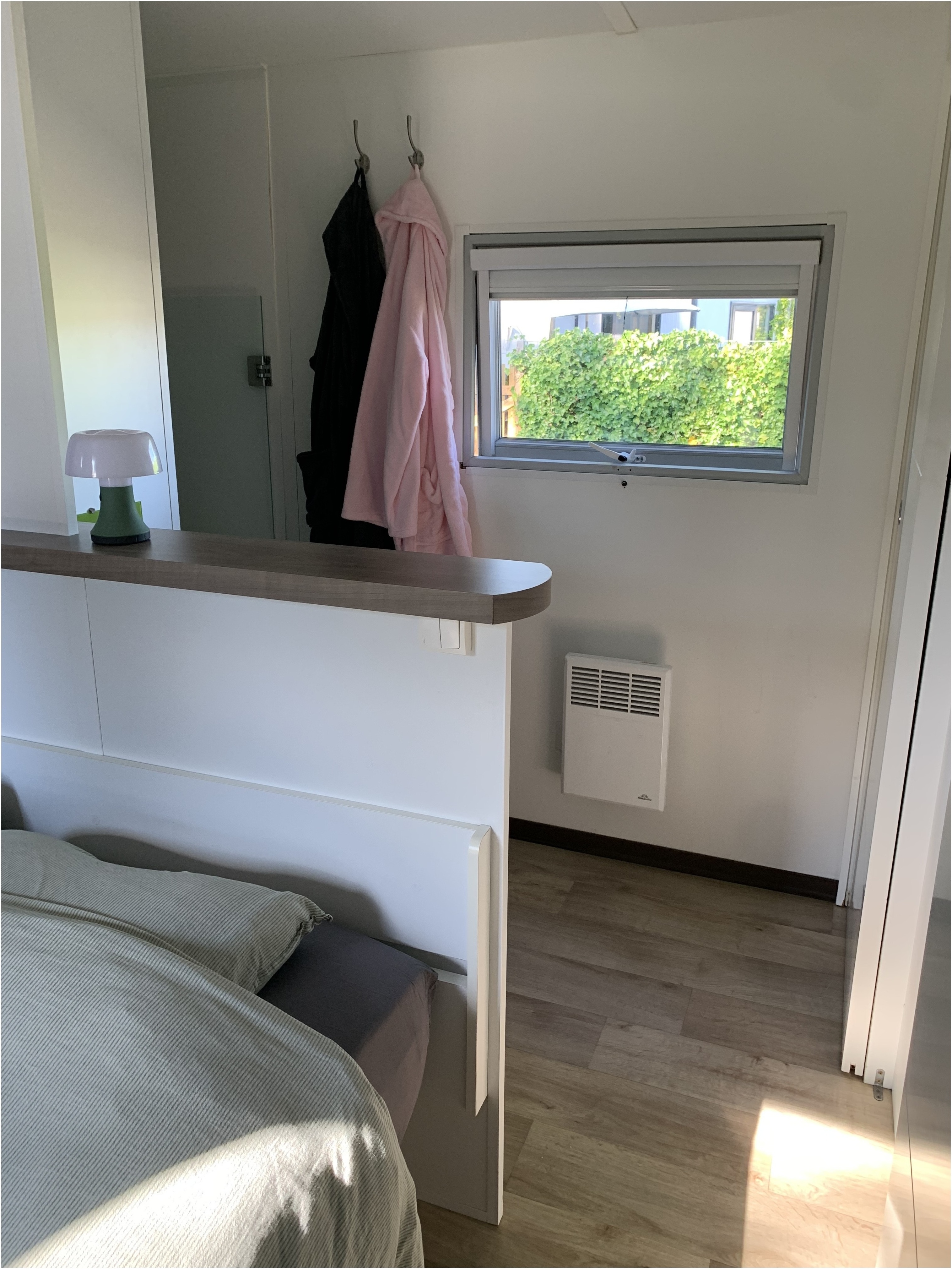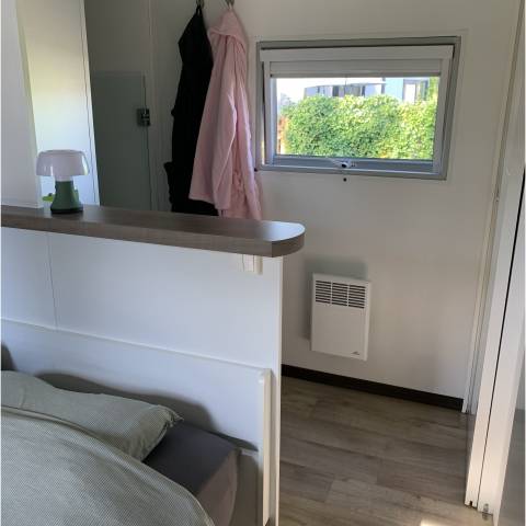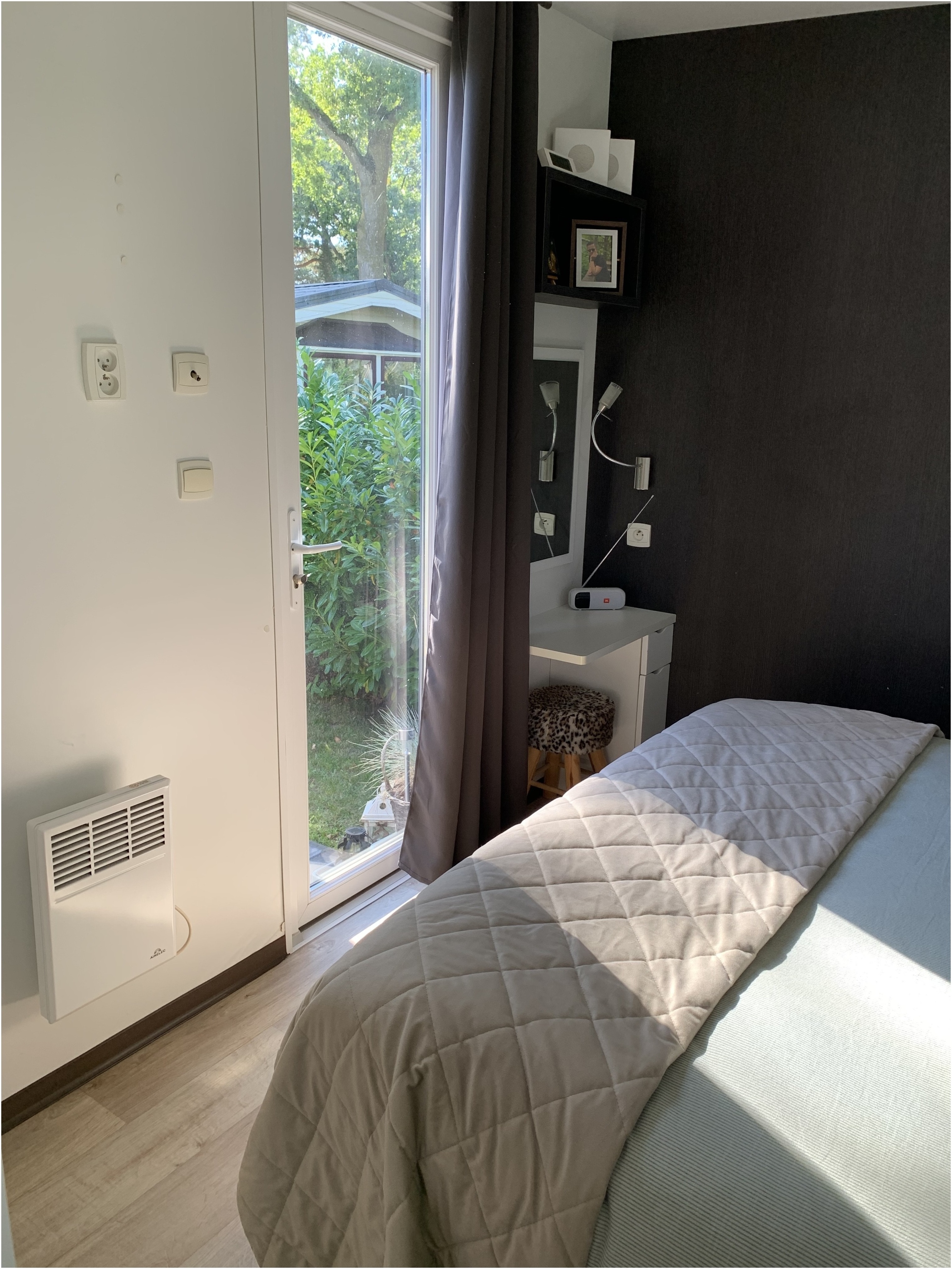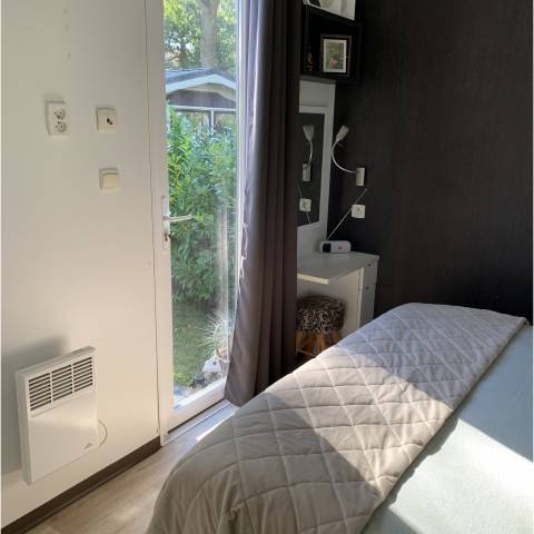 - 1 hoofdslaapkamer met een 2-persoons bed en deur naar buiten