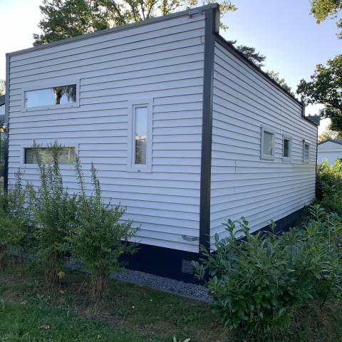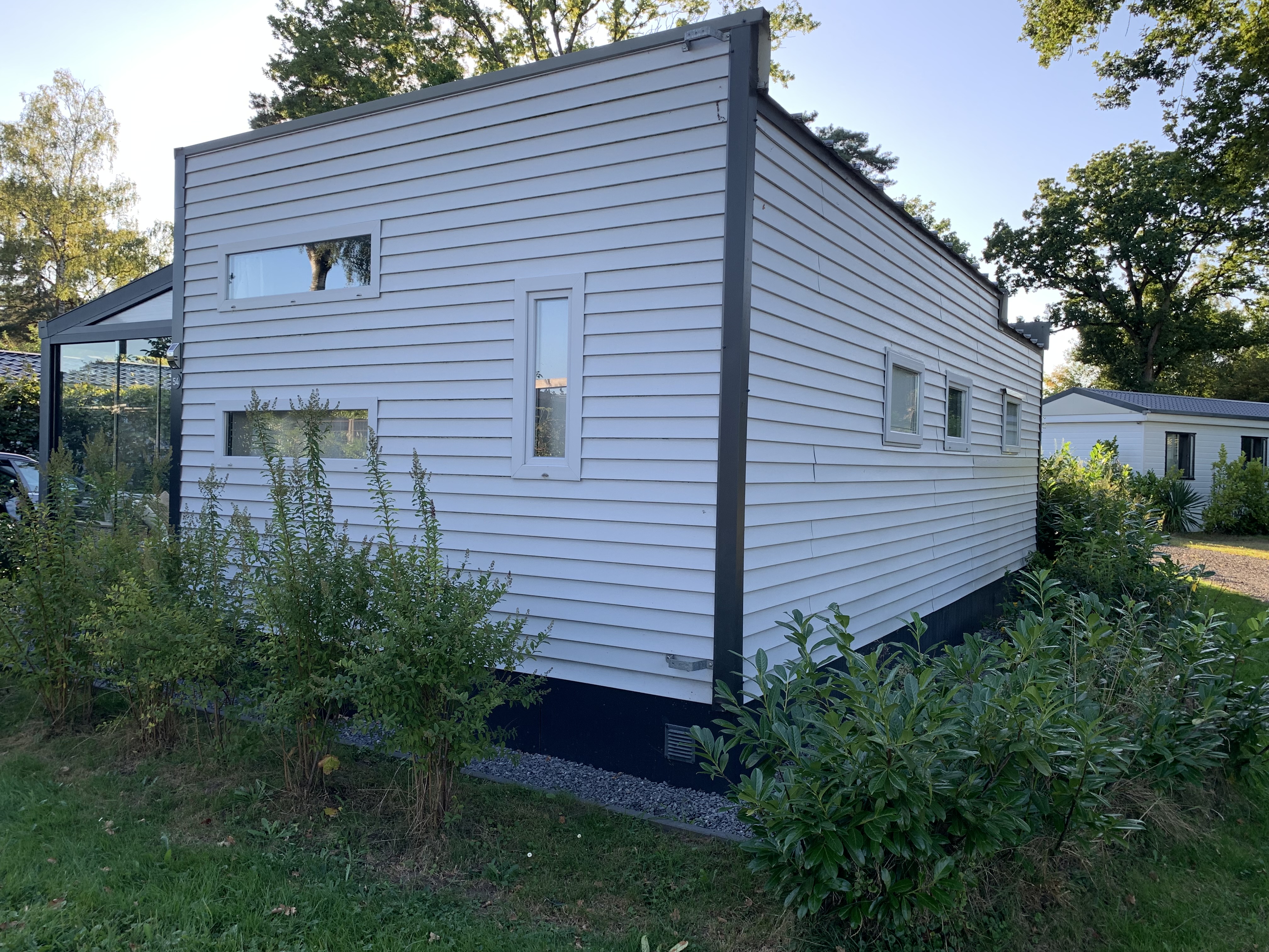 • Voorzijde chalet voorzien van nieuwe isolatie en gevelbekleding Novicell dubbelrabat (2023)