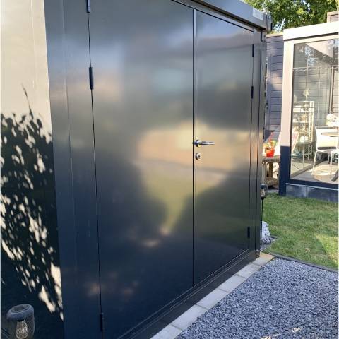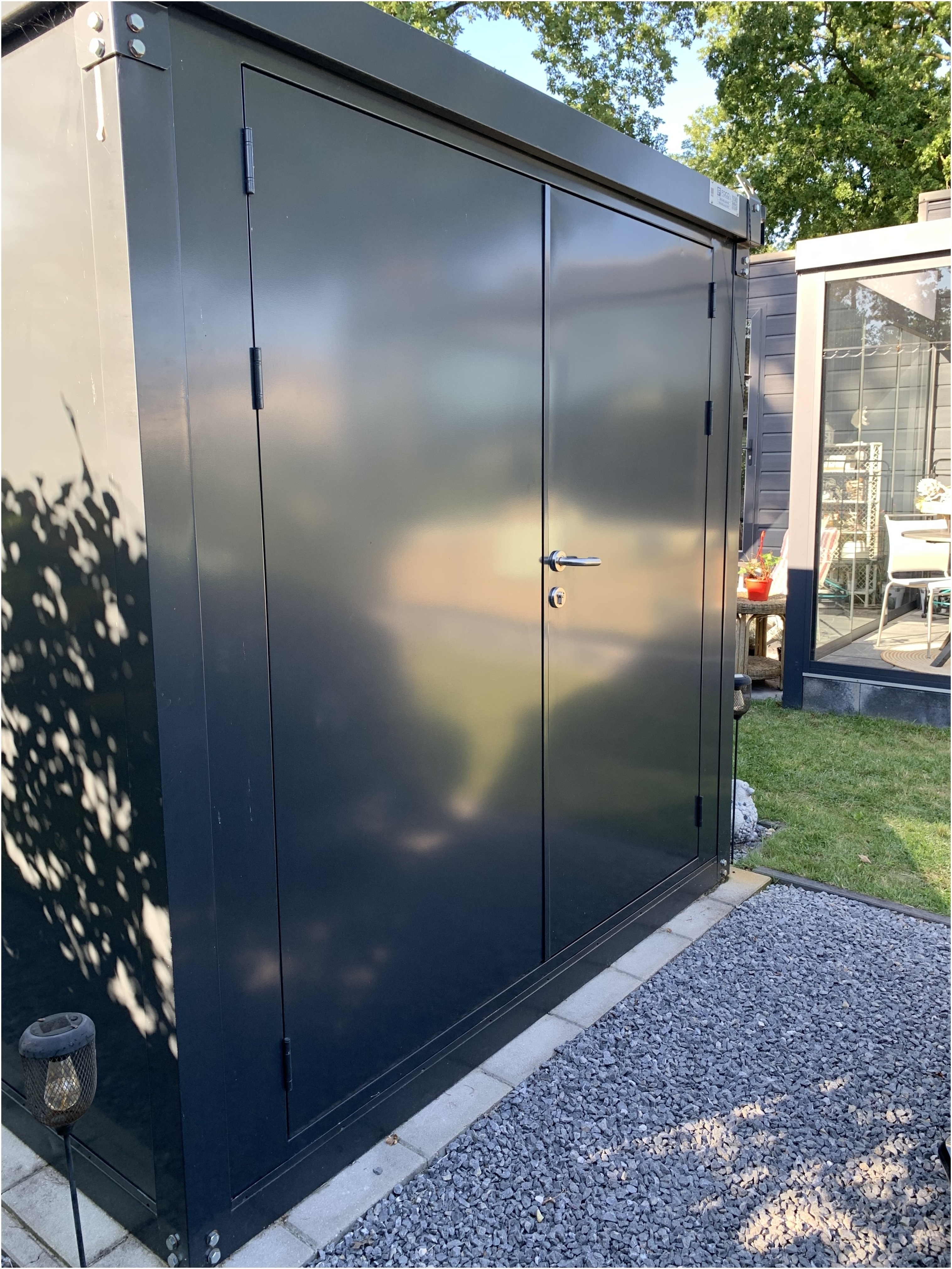 • Aan voorzijde 2 grote openslaande stalen deuren