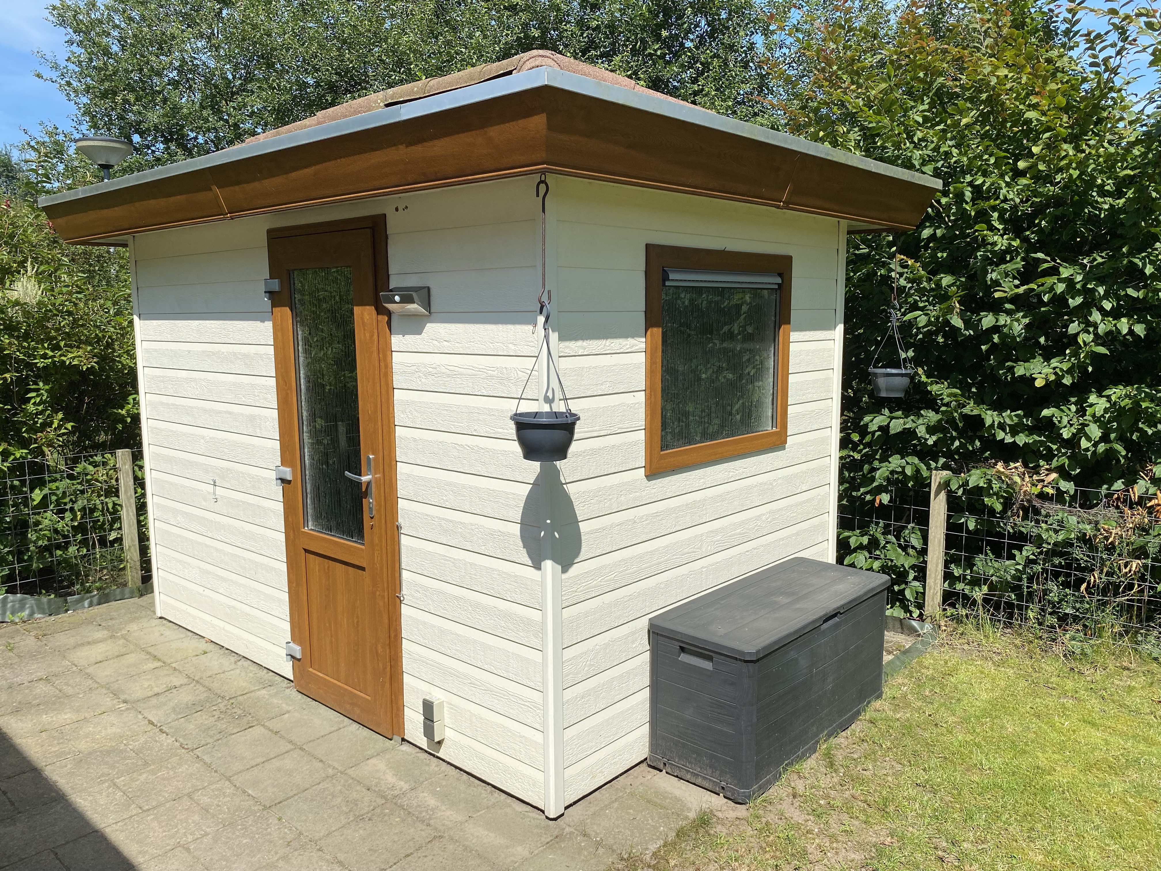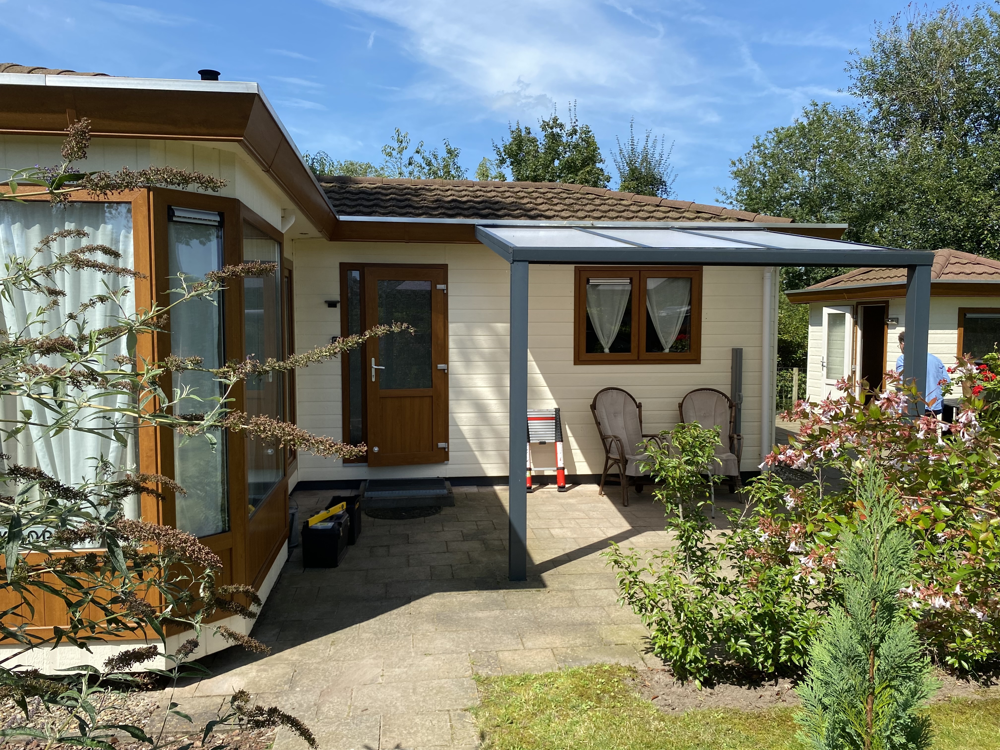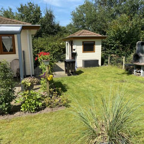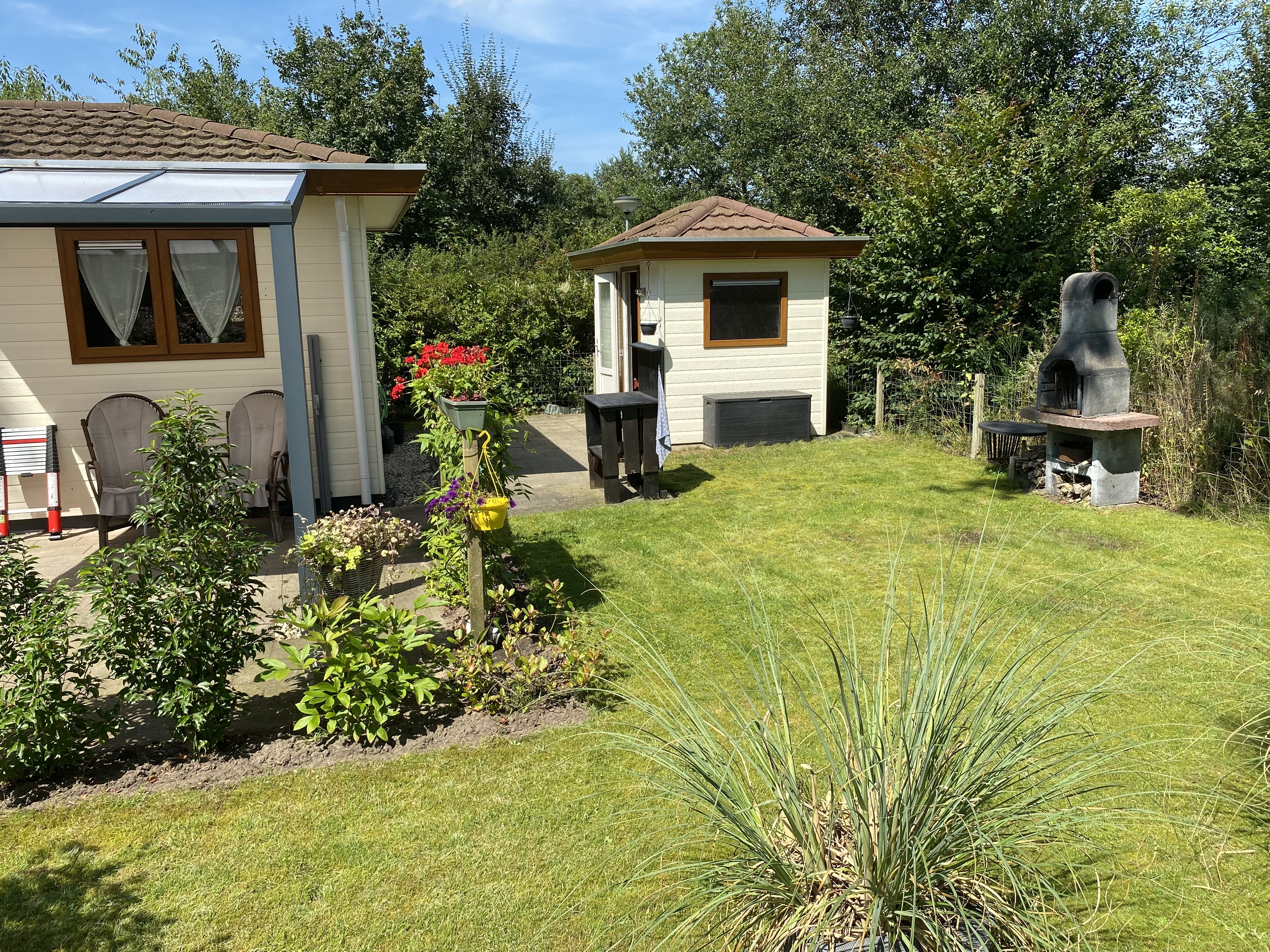 De fraai aangelegde tuin geeft redelijk wat privacy. De in hetzelfde materiaal als het chalet uitgevoerde berging is voorzien van een werkbankje. De kavel beschikt over een eigen overdekte parkeerplaats voor de auto. Een 2e overkapping is gesitueerd op het terras aan de voorzijde van het chalet. Hieronder is ook ruimte voor een tafel met stoelen om buiten, onder de overkapping, te kunnen eten. Met behulp van een uitrekbaar tuinscherm kan de privacy hier nog worden vergroot.
