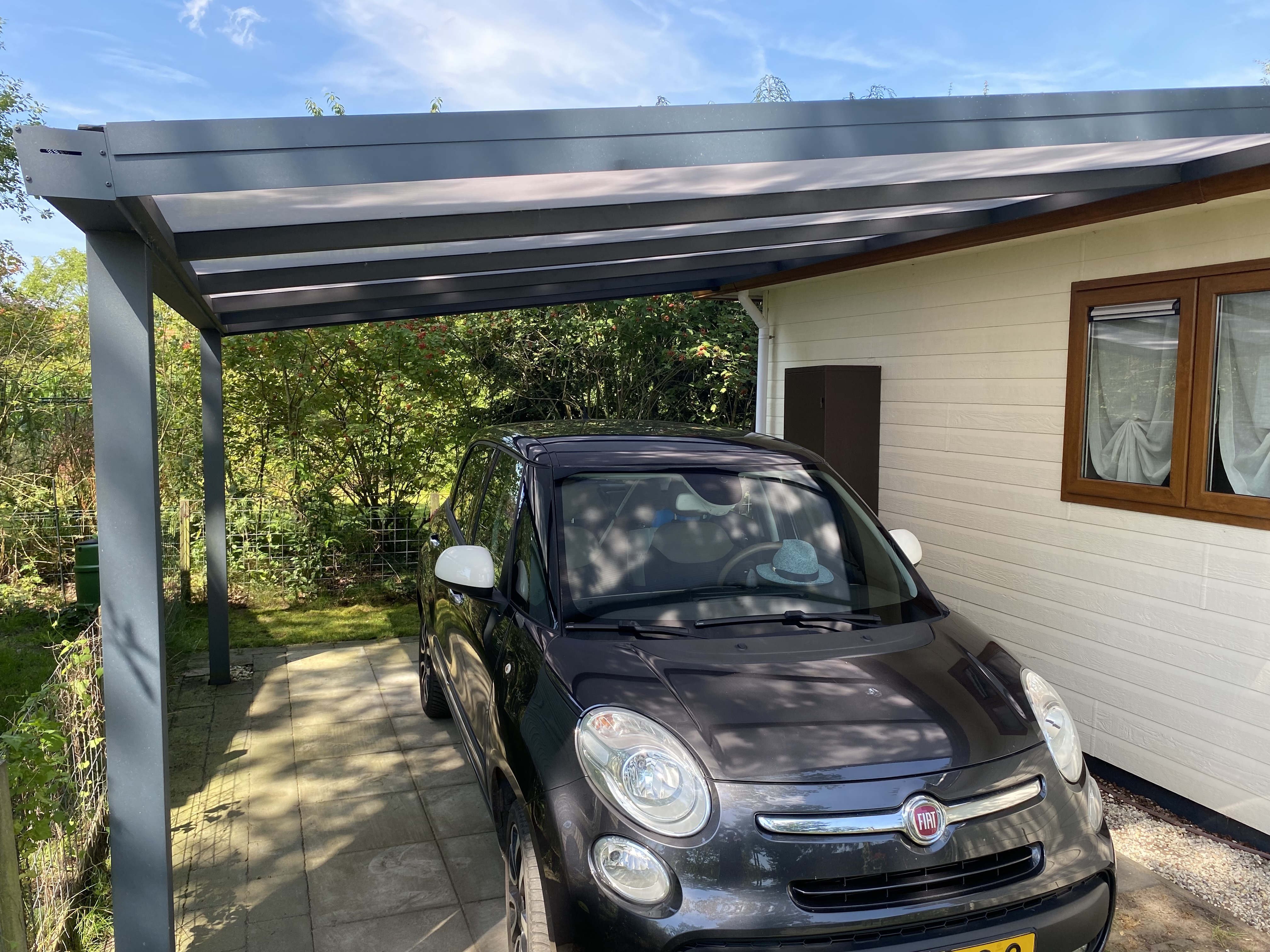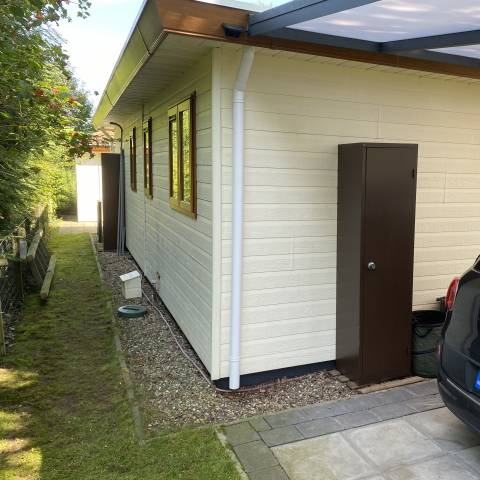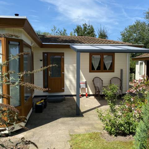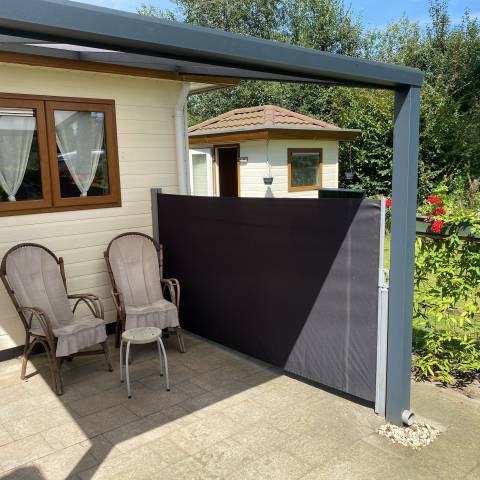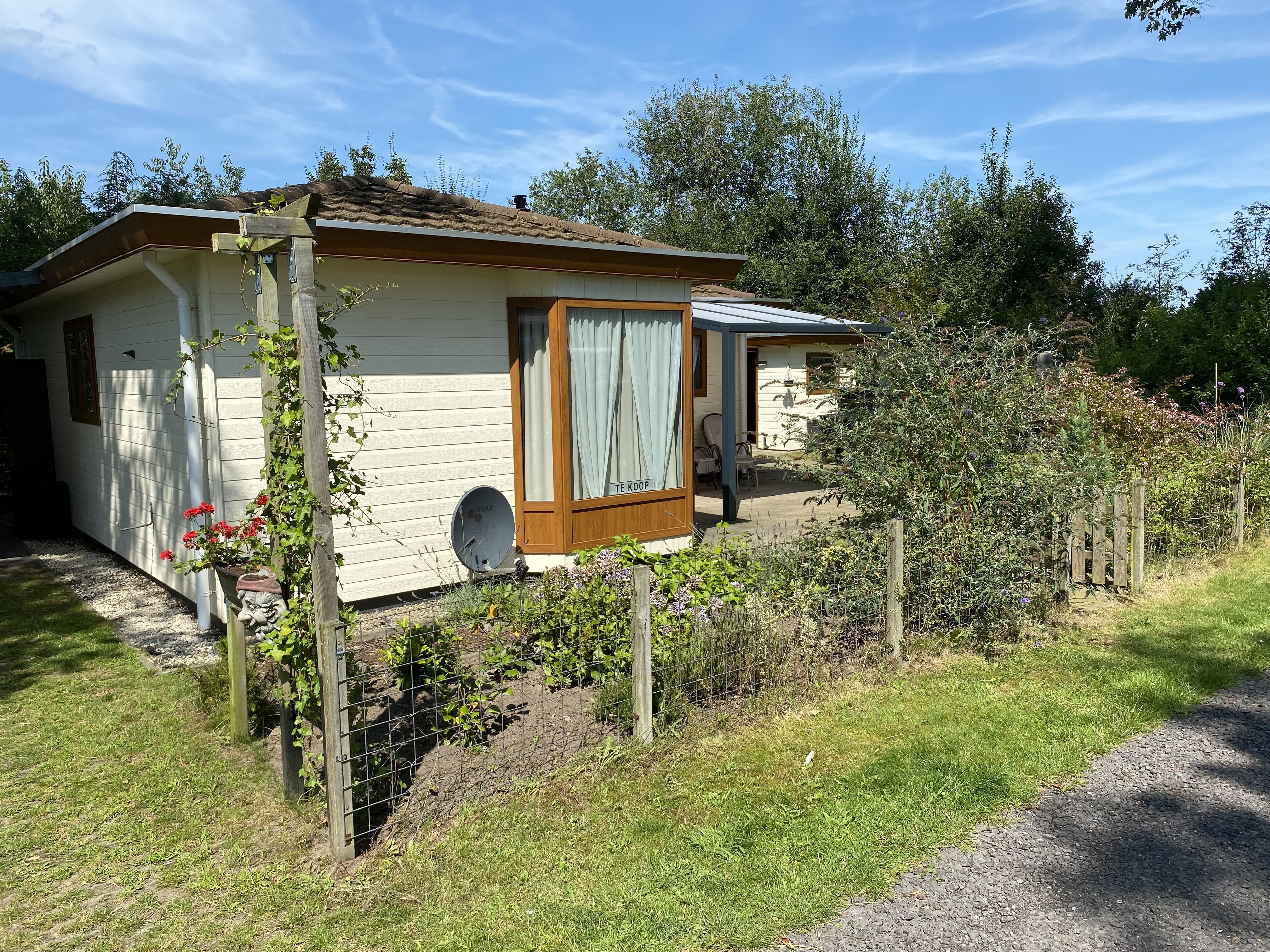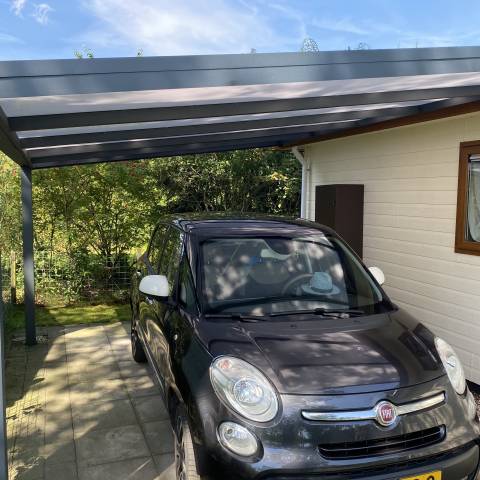De fraai aangelegde tuin geeft redelijk wat privacy. De in hetzelfde materiaal als het chalet uitgevoerde berging is voorzien van een werkbankje. De kavel beschikt over een eigen overdekte parkeerplaats voor de auto. Een 2e overkapping is gesitueerd op het terras aan de voorzijde van het chalet. Hieronder is ook ruimte voor een tafel met stoelen om buiten, onder de overkapping, te kunnen eten. Met behulp van een uitrekbaar tuinscherm kan de privacy hier nog worden vergroot.