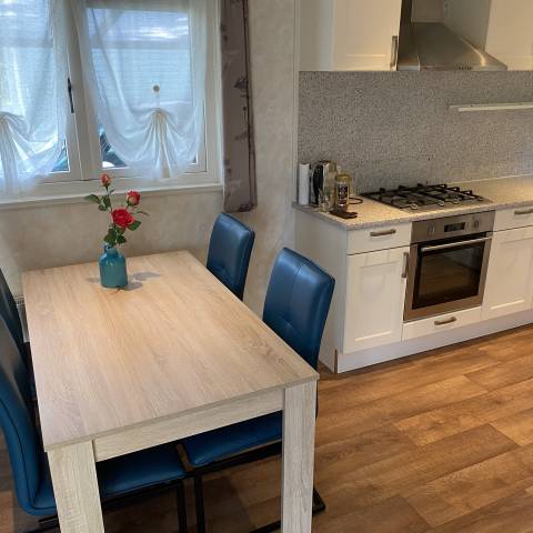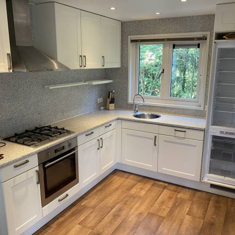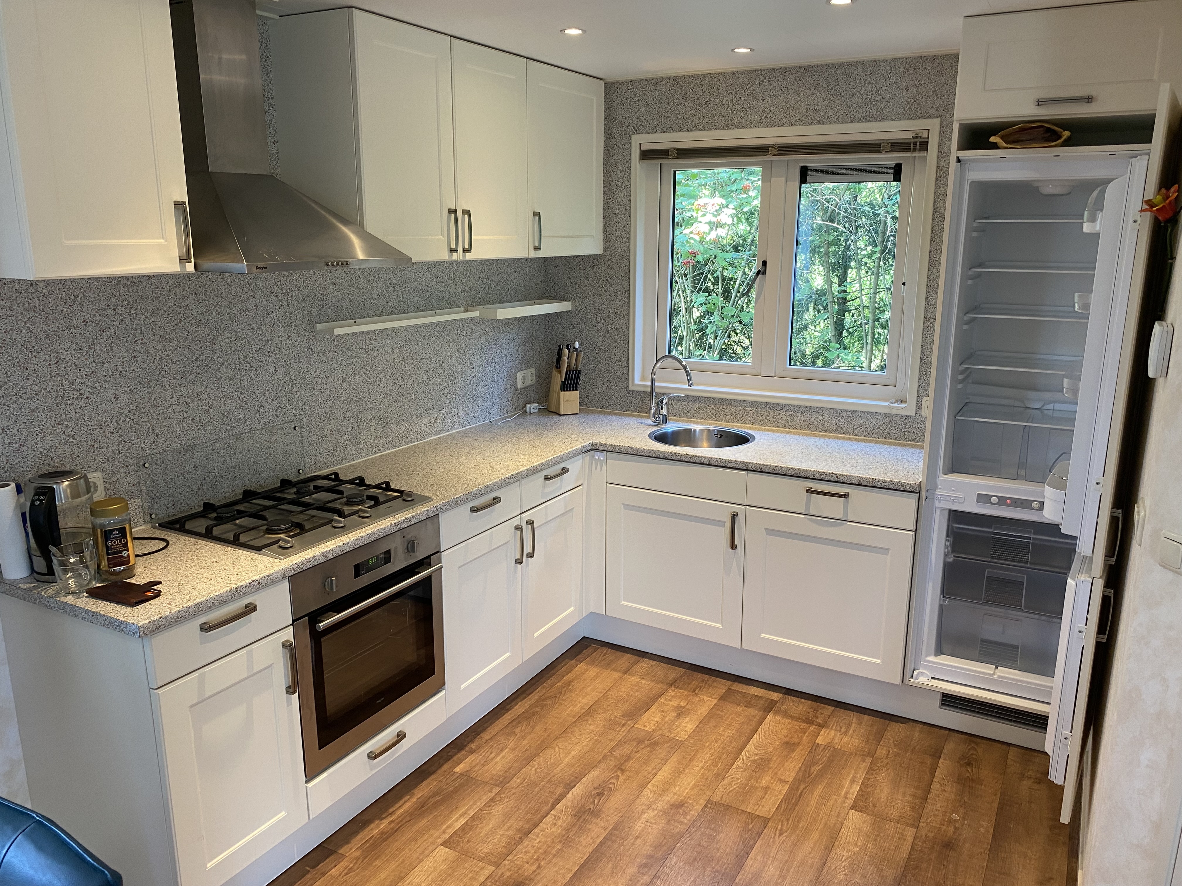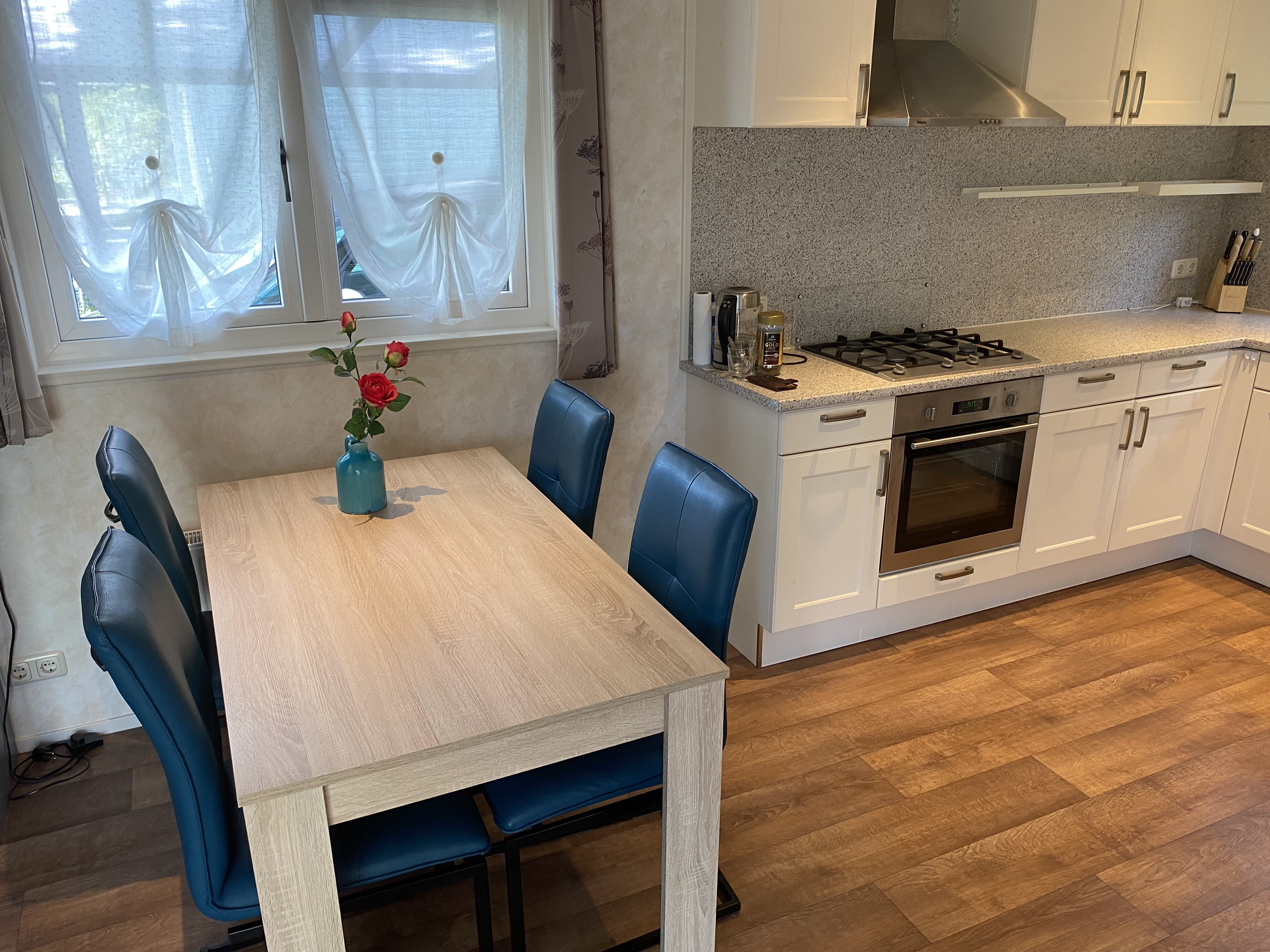 De goed uitgeruste keuken in L-vorm kent o.a. een oven, koel-/vriescombinatie en afwasmachine.