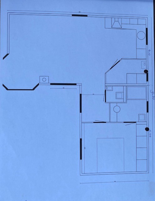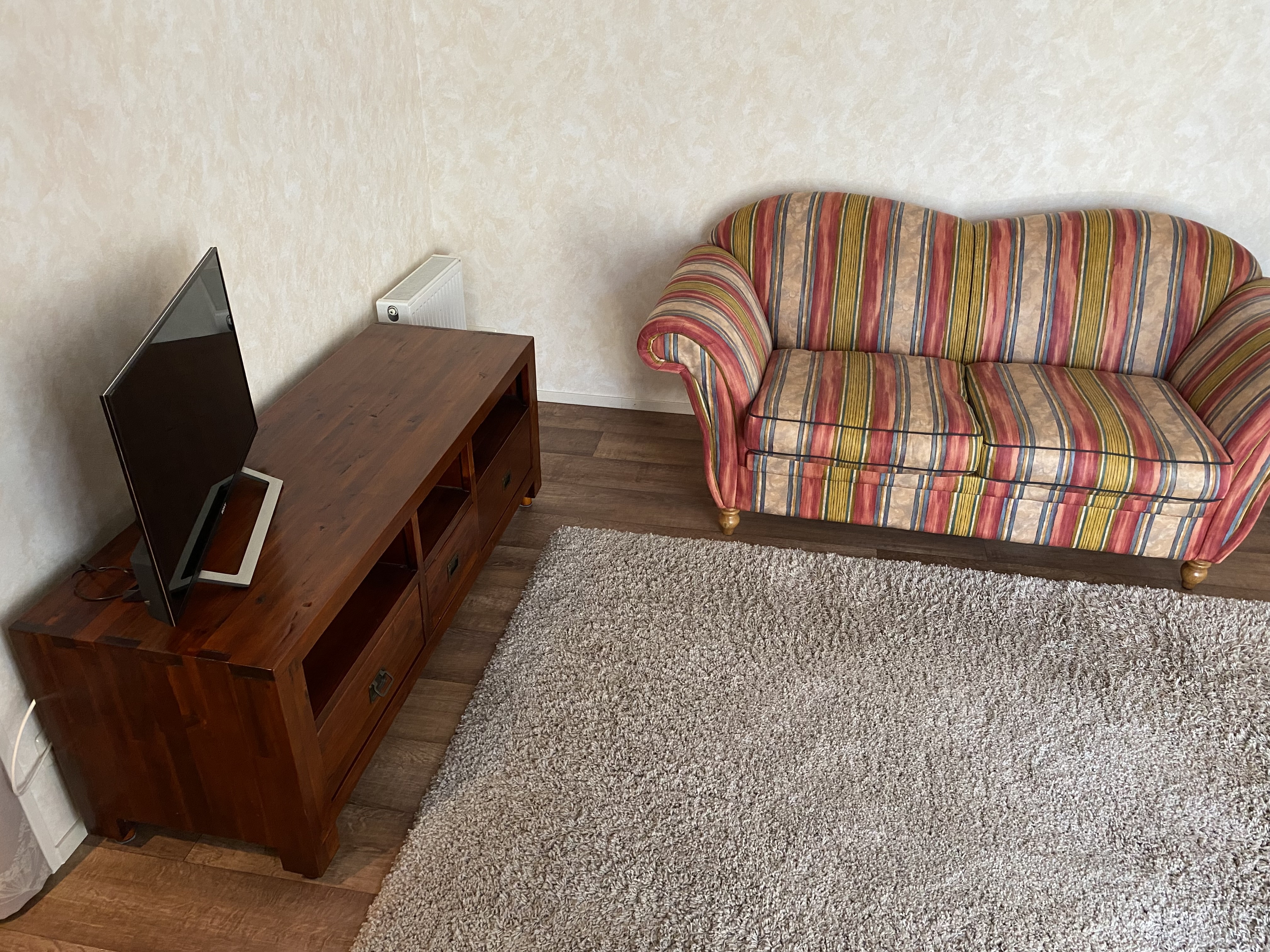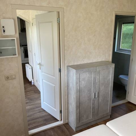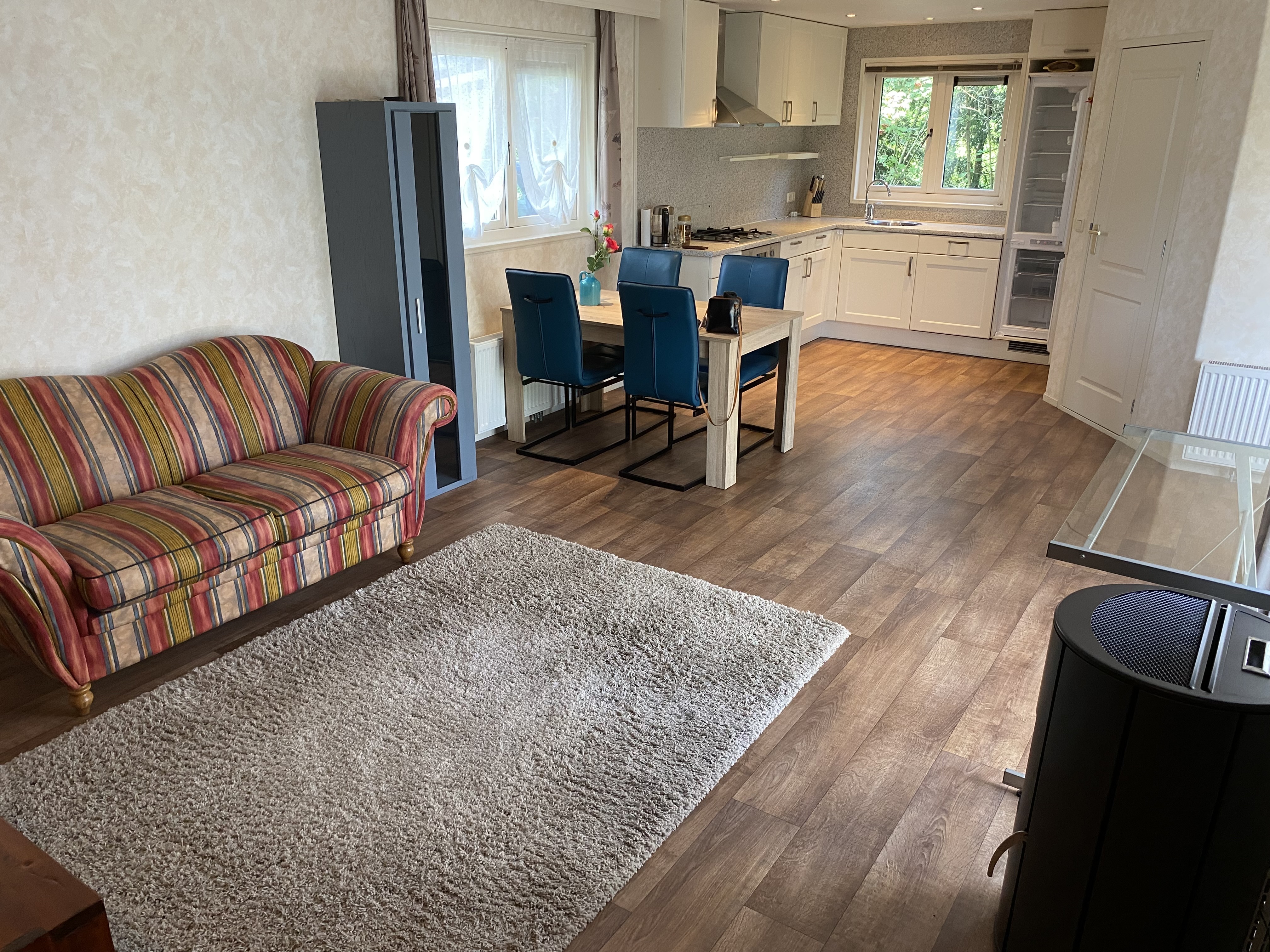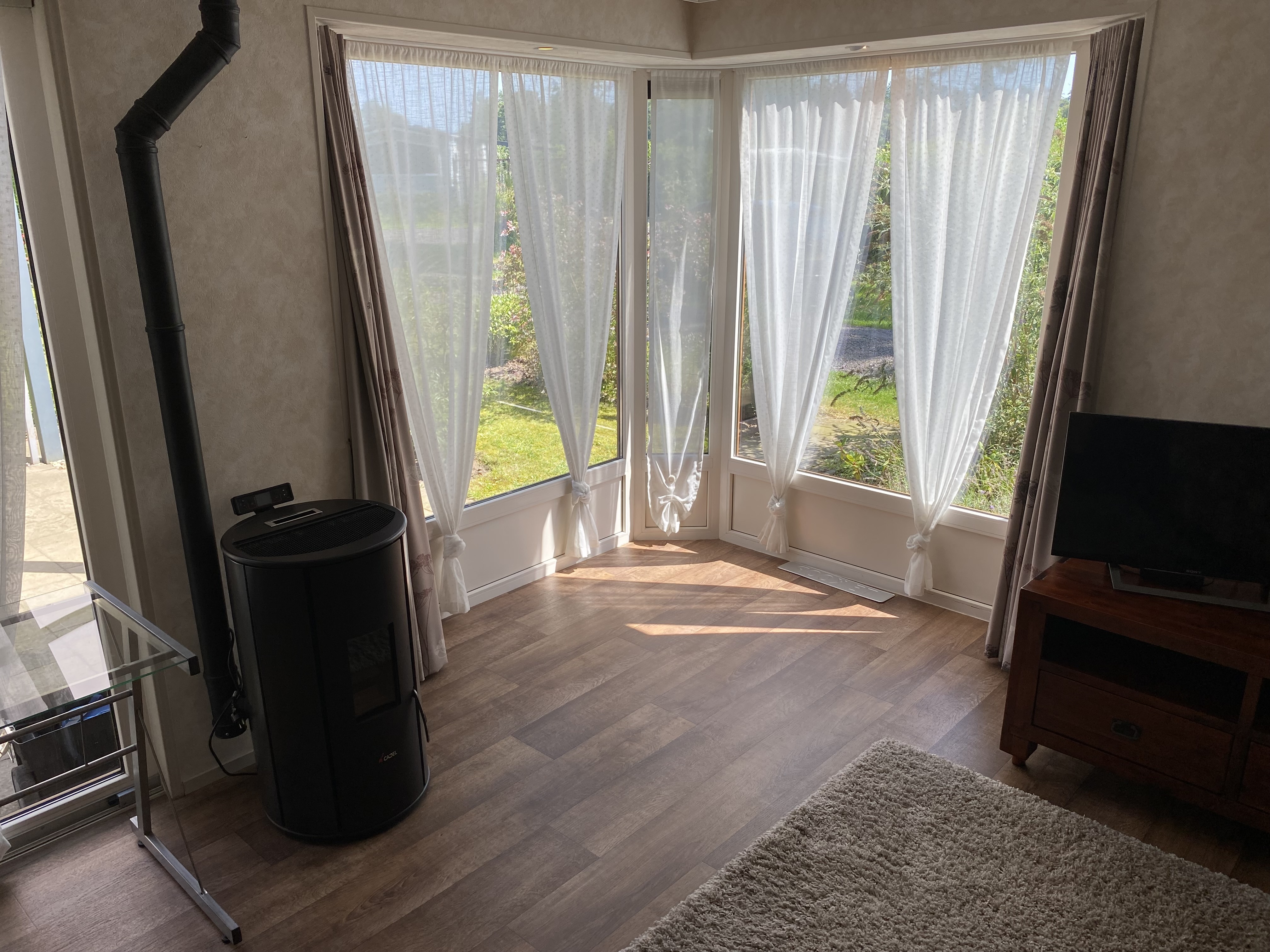 De brede woonruimte (4,10 meter) heeft een speelse uitbouw en een schuif-/kiepdeur en is voorzien van een pelletkachel waarvan het ruitje zicht geeft op het fascinerende vlammenspel. Tevens ligt in deze ruimte als extra ’n groot vloerkleed.
