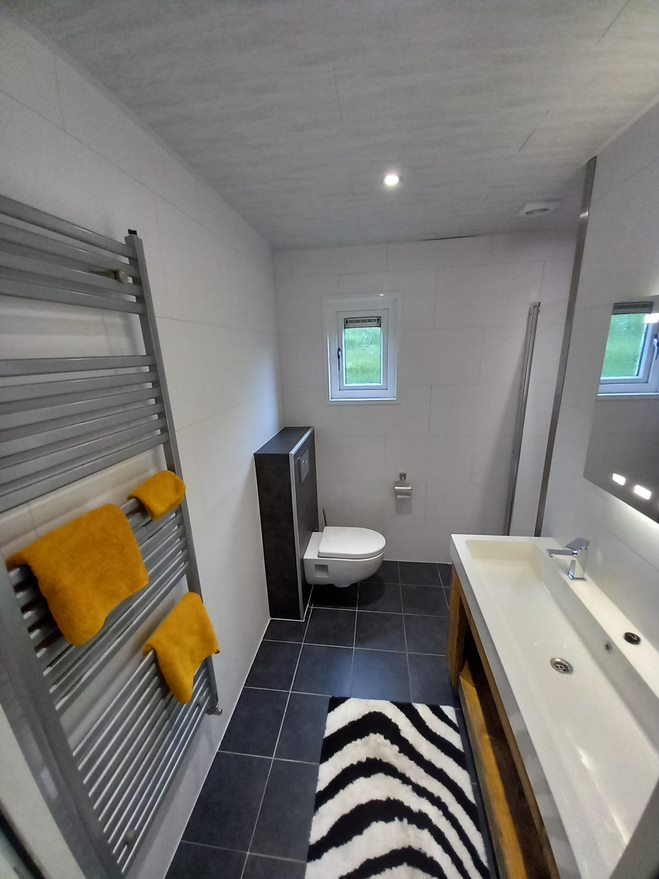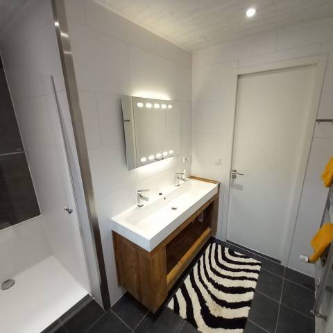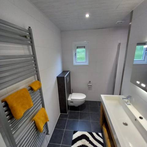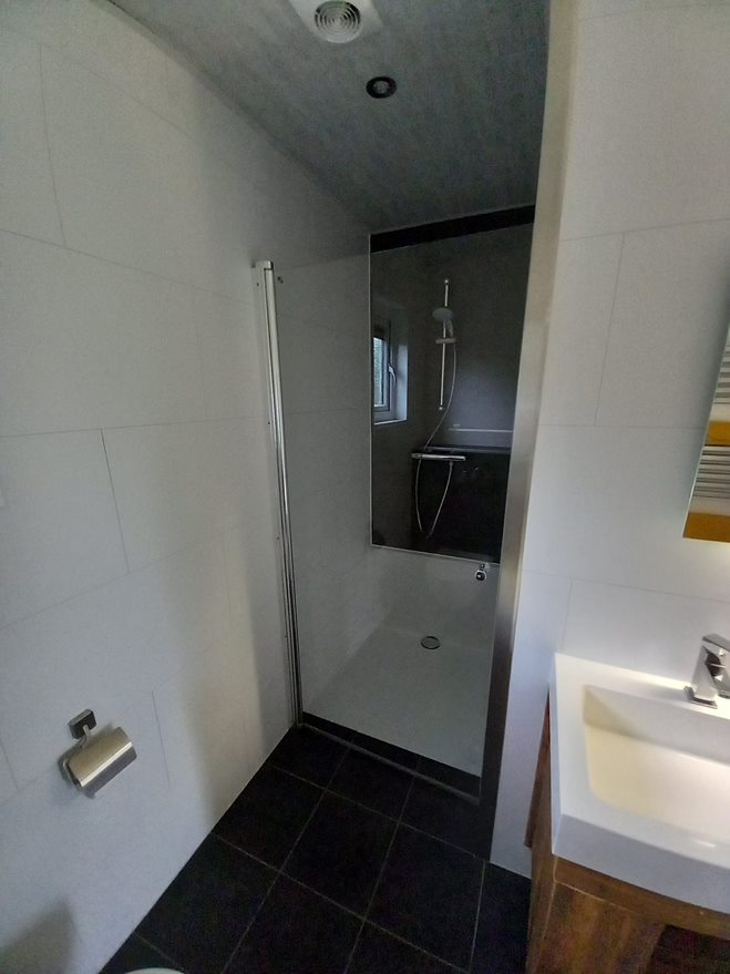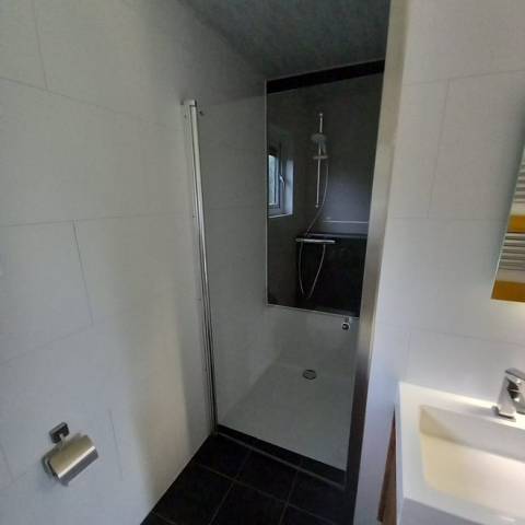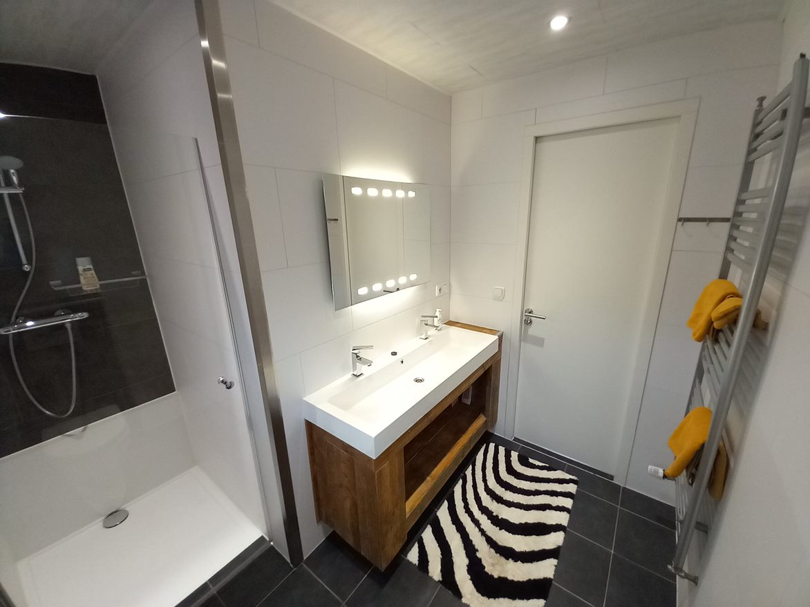 - Ruime badkamer met toilet, dubbele wastafel, ruime douchehoek 90 cm breed inclusief designradiator.