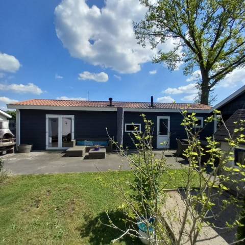Deur en raamkozijnen zijn van kunststof in de kleur wit. Deuren en ramen zijn voorzien van HR++ dubbelglas, anti inbraak hang en sluitwerk en tochtstrippen. Op 5 plaatsen zijn afsluitbare Duco ventilatieroosters in de ramen aangebracht. Het Dak is opgebouwd van vuren houten spanten constructie h.o.h. 61 cm. Met daarop osb multiplex van 18 mm dik. Op het obs multiplex wordt een isolatie pir plaat met rd waarde van 3,15 en dampopen folie aangebracht en afgewerkt met metalen dakpanplaten. Het regenwater wordt afgevoerd door vier regenpijpen in de kleur wit op iedere hoek van het chalet.